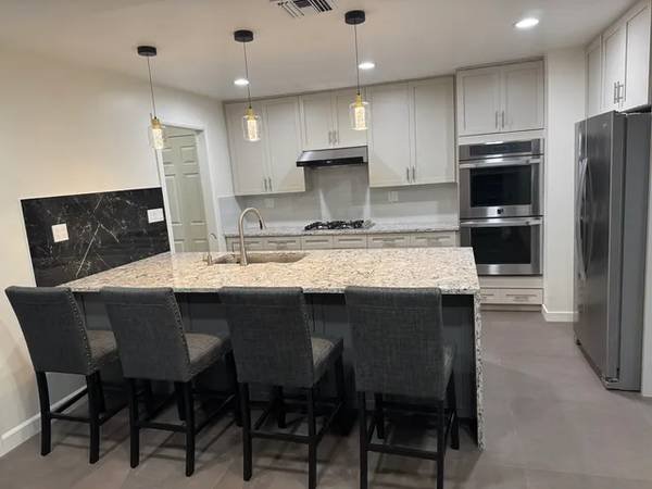 - Updated kitchen with quartz countertops, shaker cabinetry, double ovens, and large island