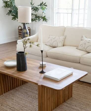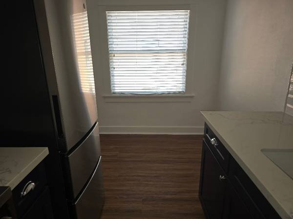 An elegant, fully renovated studio apartment in a historic 1925 Hollywood building. The unit features modern appliances, custom shelving, new flooring, and a private bathroom. Rent is $1,499/month for 450 square feet. The property includes a beautifully maintained garden courtyard with lounge seating, a fire pit, and a barbecue area.
