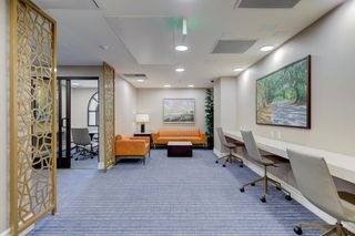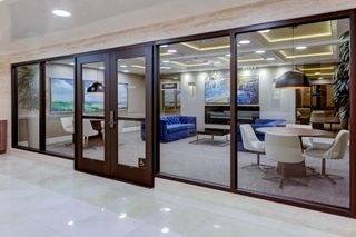 - Expansive lobby featuring a wall fountain, illuminated artwork, a coffee bar, waiting areas, and a connected lounge.
