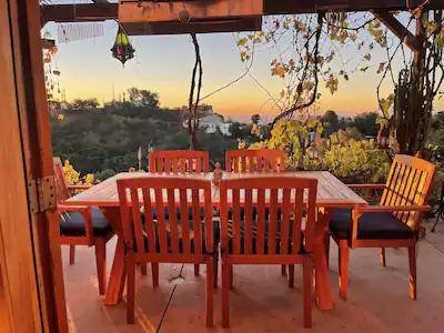 A private studio apartment with a private bathroom and separate entrance, located in a captivating home near the summit of the Hollywood Hills. The unit includes a fully enclosed yard with a swimming pool and spa, offering stunning panoramic views of the city, mountains, and ocean.