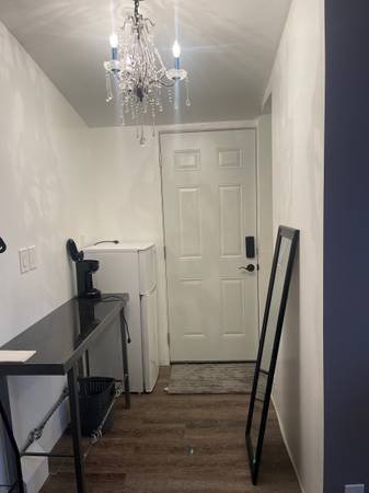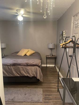 This small, private room features its own entrance and bathroom, with no shared common areas. Includes a kitchenette (fridge & microwave, no stove). Available furnished (queen bed) or unfurnished. Utilities: internet included; gas & DWP split monthly.
