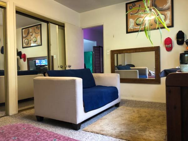 This appealing room in a meticulously kept apartment offers a tranquil courtyard view just a short distance from Hollywood Boulevard. The rate is $420/week (cash preferred) and includes high-speed WiFi. The room is private, smoke-free, and furnished with a queen bed, sofa, and kitchenette appliances.