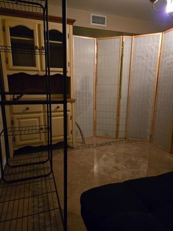 A fully furnished, private first-floor area in a gated townhouse. The space is separated by a screen and includes a futon sofa and dresser. The monthly rate is $625 with a $100 deposit. All utilities are included. Suitable for one individual. Cooking is limited to microwave and toaster oven use.