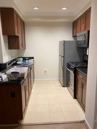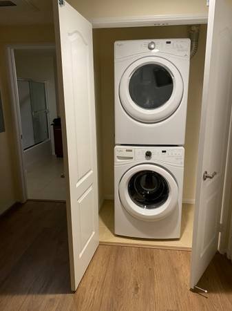 A fully furnished queen-sized bedroom is available for rent, with occupancy beginning on December 1st. The room features a king-sized bed and shares the living room and kitchen with one other resident in this two-bedroom, two-bathroom apartment. The unit includes an in-home washer and dryer, as well as a private balcony overlooking the courtyard.