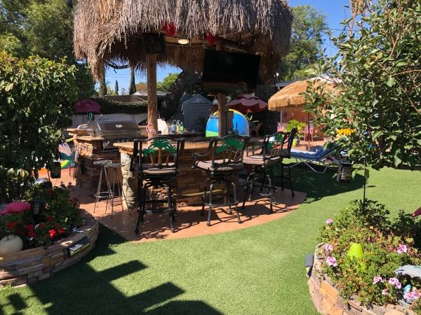 - Swimming pool, tiki bar and grill, and patio furniture.