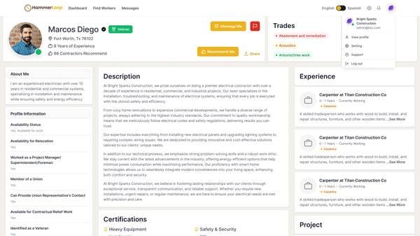 Workers can set up a complimentary profile, specifying their trade specialty and geographic location, which employers can then immediately search. When employers list job opportunities on the platform, they specify the trade to which the posting should be directed, and workers in the relevant area receive alerts for matching positions. Interested workers can review the job details and, if they wish to apply, click the 'loop me in' button to submit their profile directly to the employer. Subsequent communication can be handled entirely within the platform's messaging system.