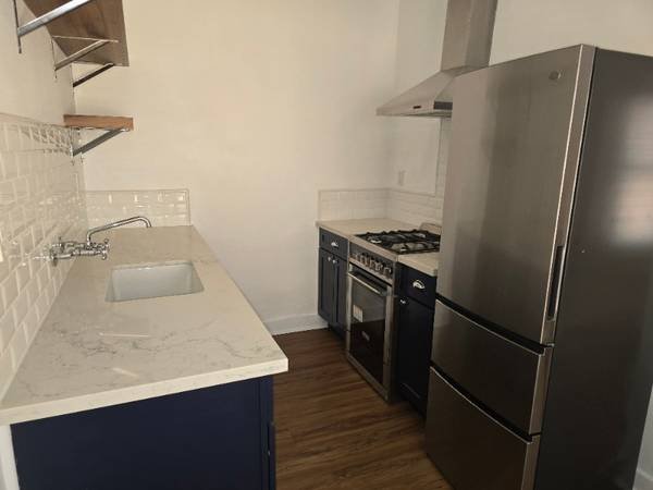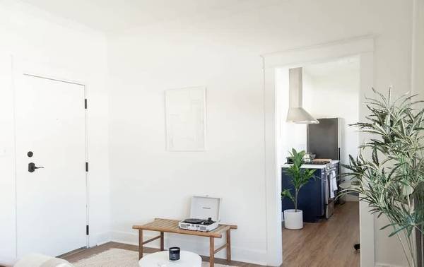 An elegant, fully renovated studio apartment in a historic 1925 Hollywood building. The unit features modern appliances, custom shelving, new flooring, and a private bathroom. Rent is $1,499/month for 450 square feet. The property includes a beautifully maintained garden courtyard with lounge seating, a fire pit, and a barbecue area.
