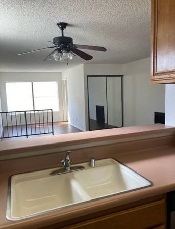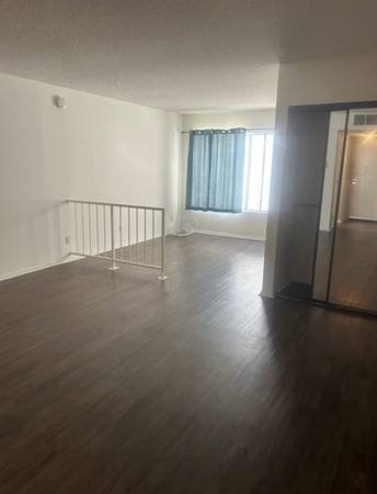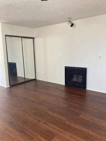 This is a spacious and comfortable single-bedroom apartment, a notable exception to typically compact units. The monthly rent is $1,750. The apartment features dark laminate flooring, a fireplace, and includes an enclosed garage parking spot. The location is on Moorpark, just off Coldwater in Sherman Oaks.