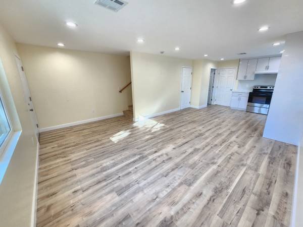 This is a newly constructed, 1,200 sq ft accessory dwelling unit (ADU) with three bedrooms and two bathrooms. The unit includes all utilities except electricity. It features fresh paint, recessed lighting, laminate flooring, stainless steel appliances, quartz countertops, and in-unit laundry.