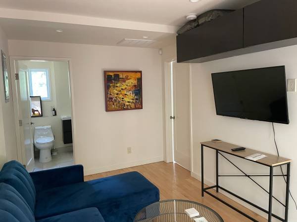 This charming, self-contained unit offers a private bedroom, living area, dining space, compact kitchen, and a private bathroom. Available for short or long-term stays with flexible pricing: $95/night, $600/week, or $2,300/month. Includes a private entrance, outdoor access, and abundant natural light.