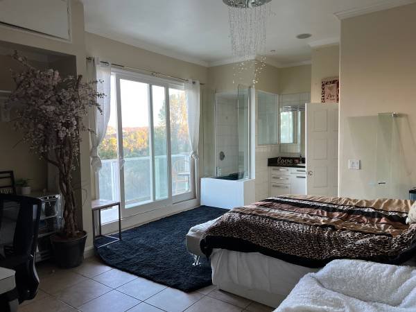 Overview: A beautiful, spacious, and furnished master bedroom is available for immediate move-in within a hillside mansion in Chatsworth. The room includes a private bathroom and a huge private balcony with incredible views. Price is $1,950/month, plus a share of utilities. Special move-in incentives are available.