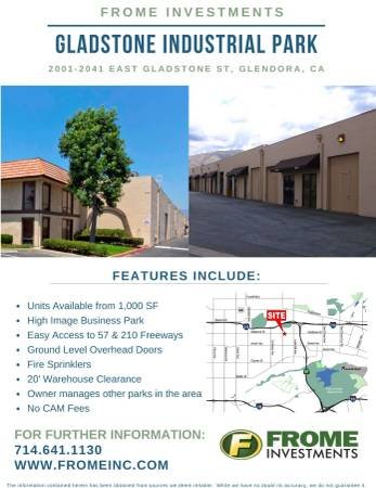 FROME INVESTMENTS – Offering warehouse and office units in the Gladstone Industrial Park at 2001-2041 East Gladstone Street, Glendora, CA. Units start from 1,000 square feet with no Common Area Maintenance (CAM) fees.