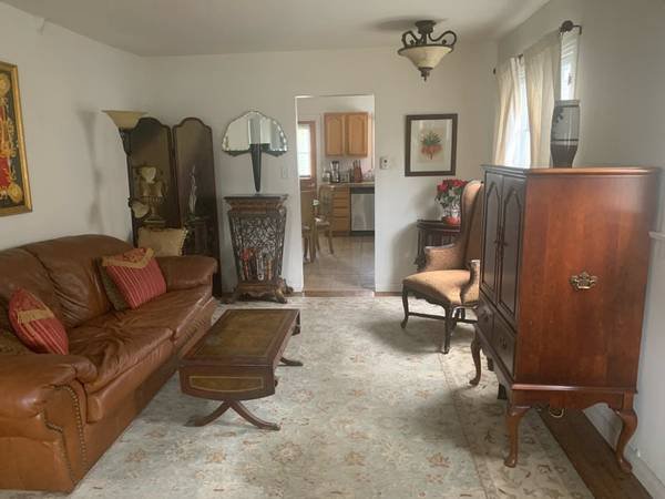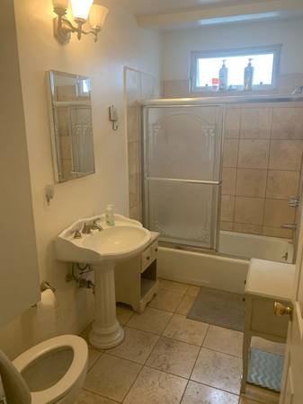 A bright, furnished room with a private bathroom is available in the upper unit of a charming Spanish-style duplex. The rent is $1,200 per month with a 6-month lease, available for move-in on the 30th or 1st. The room includes a full-size bed with storage and a settee.