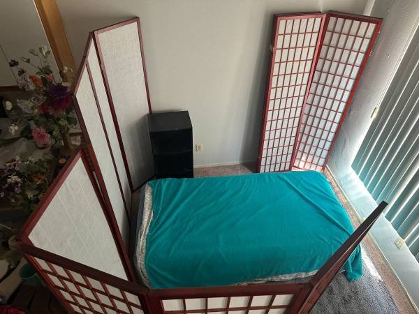$225/week (cash only, max 3 weeks). Unfurnished space separated by dividers on the lower level of a two-story apartment. Includes utilities (water, gas, electricity, wifi) and access to kitchen for light cooking.