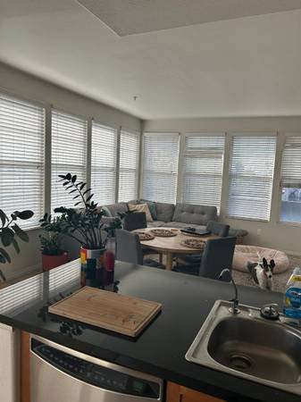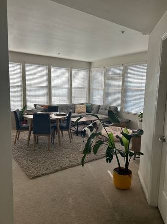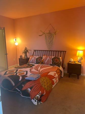 Furnished bedroom available for rent in a three-bedroom condo. The room includes a large private bathroom with a tub and separate shower, a walk-in closet, and a 70-inch TV. All utilities and internet are included. Move-in/out dates are flexible.