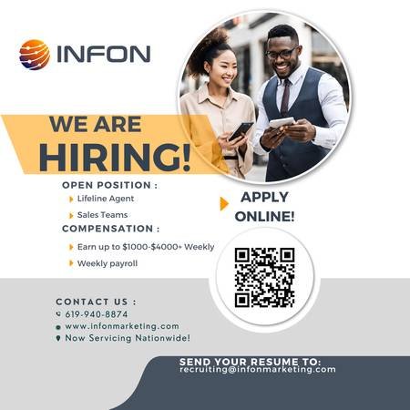Become a local authority helping eligible customers enroll in complimentary Lifeline Assistance and Affordable Connectivity Program services on the nationwide T-Mobile network. This position requires over 51% field work promoting services and involves travel within a 50-mile radius of your designated city. Join Infon, a leading Master agency, and benefit from the industry's most robust compensation plan and extensive support from leadership with over 15 years of expertise.